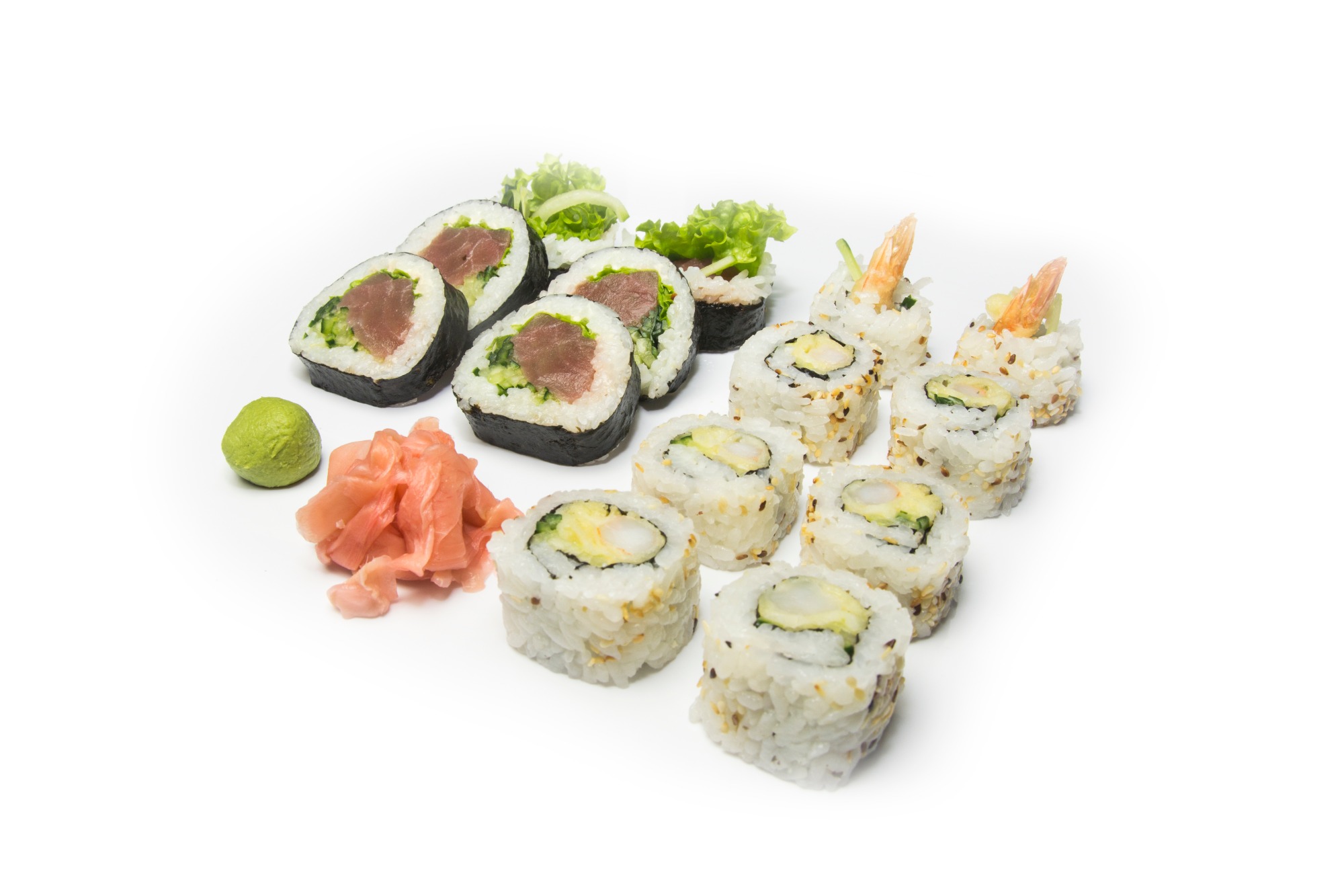 krewetka pieczona w tempurze, sałata, majonez, ogórek, kanpyo -