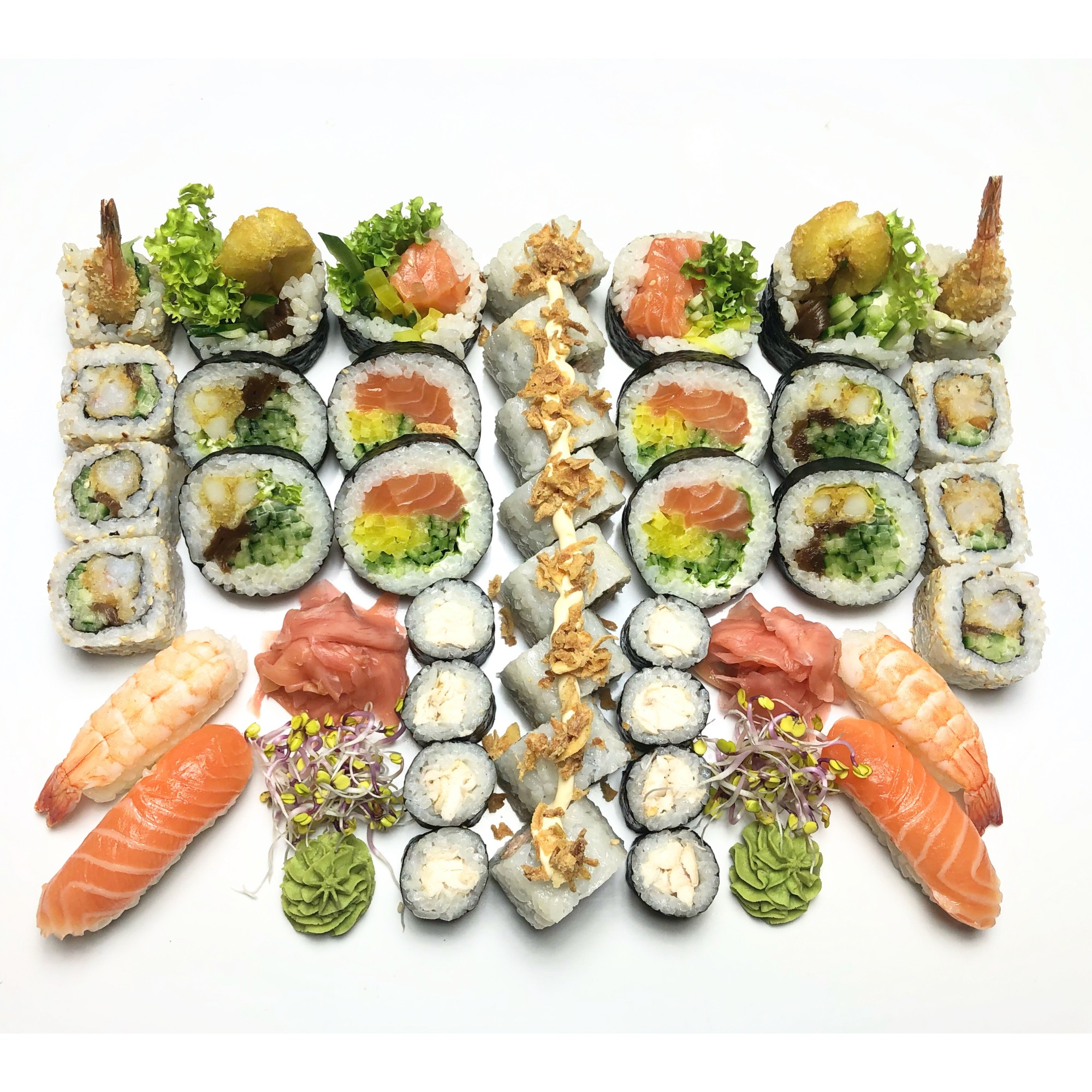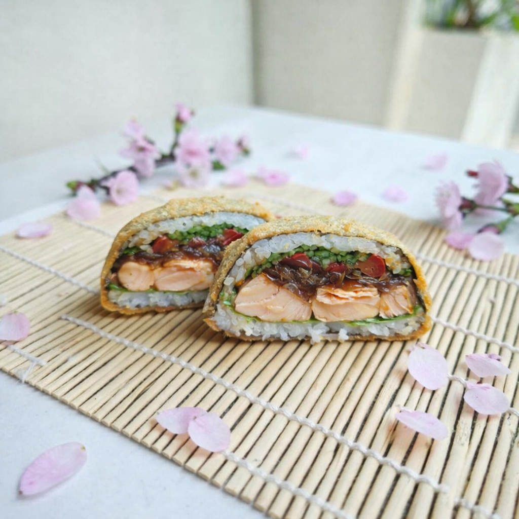 łosoś pieczony, majonez, ogórek, kanpyo, sos czosnkowy, prażona cebulka -